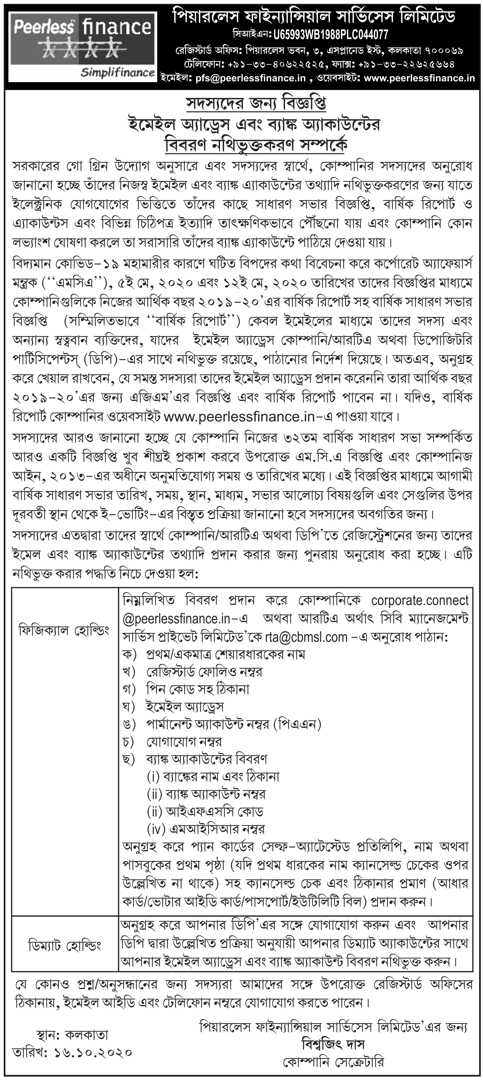 Notice to the members regarding registration of Email, Address and Bank Account Details 2019-20- Bengali